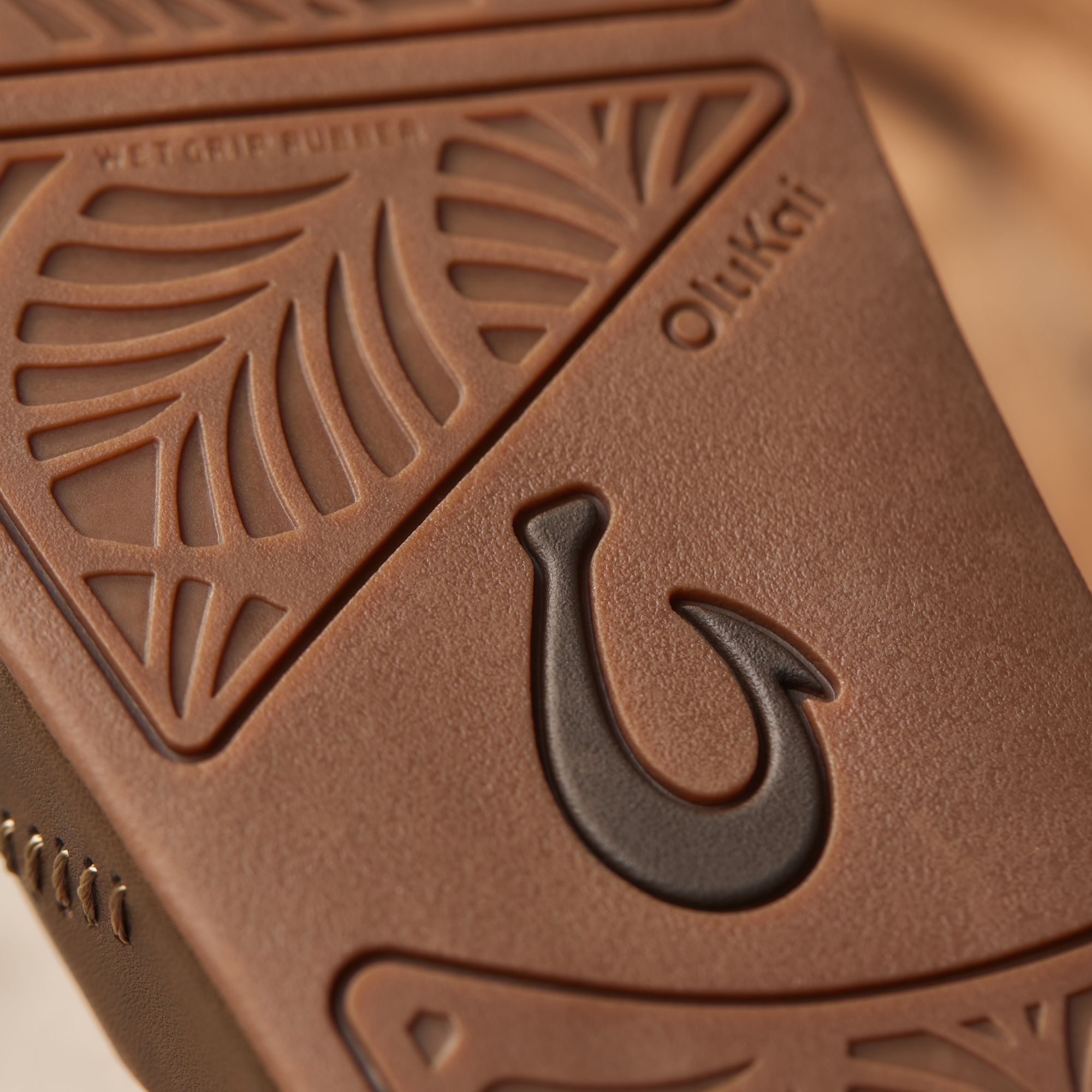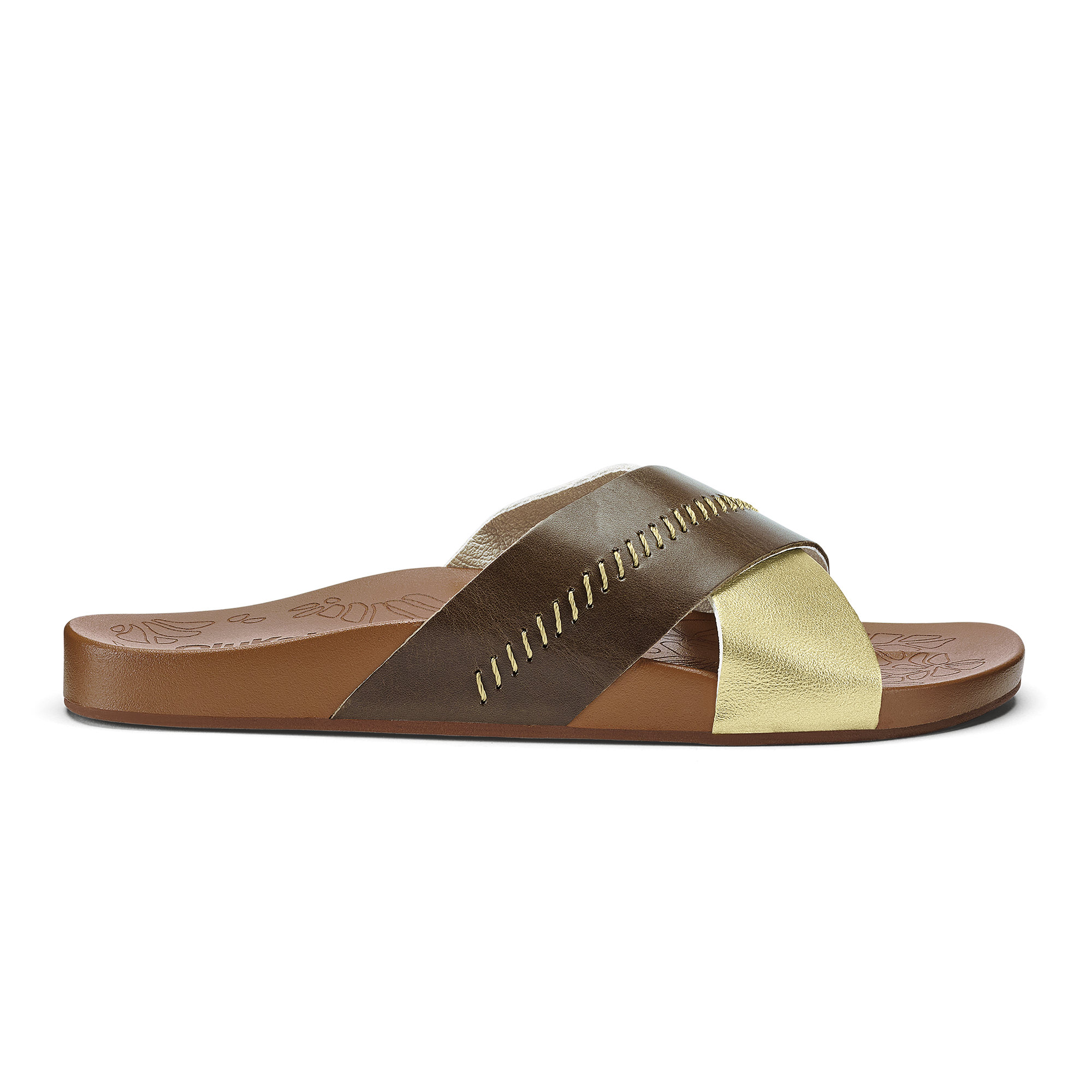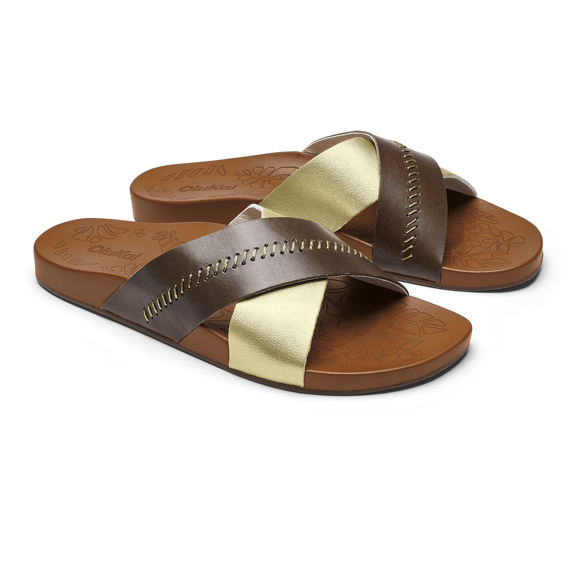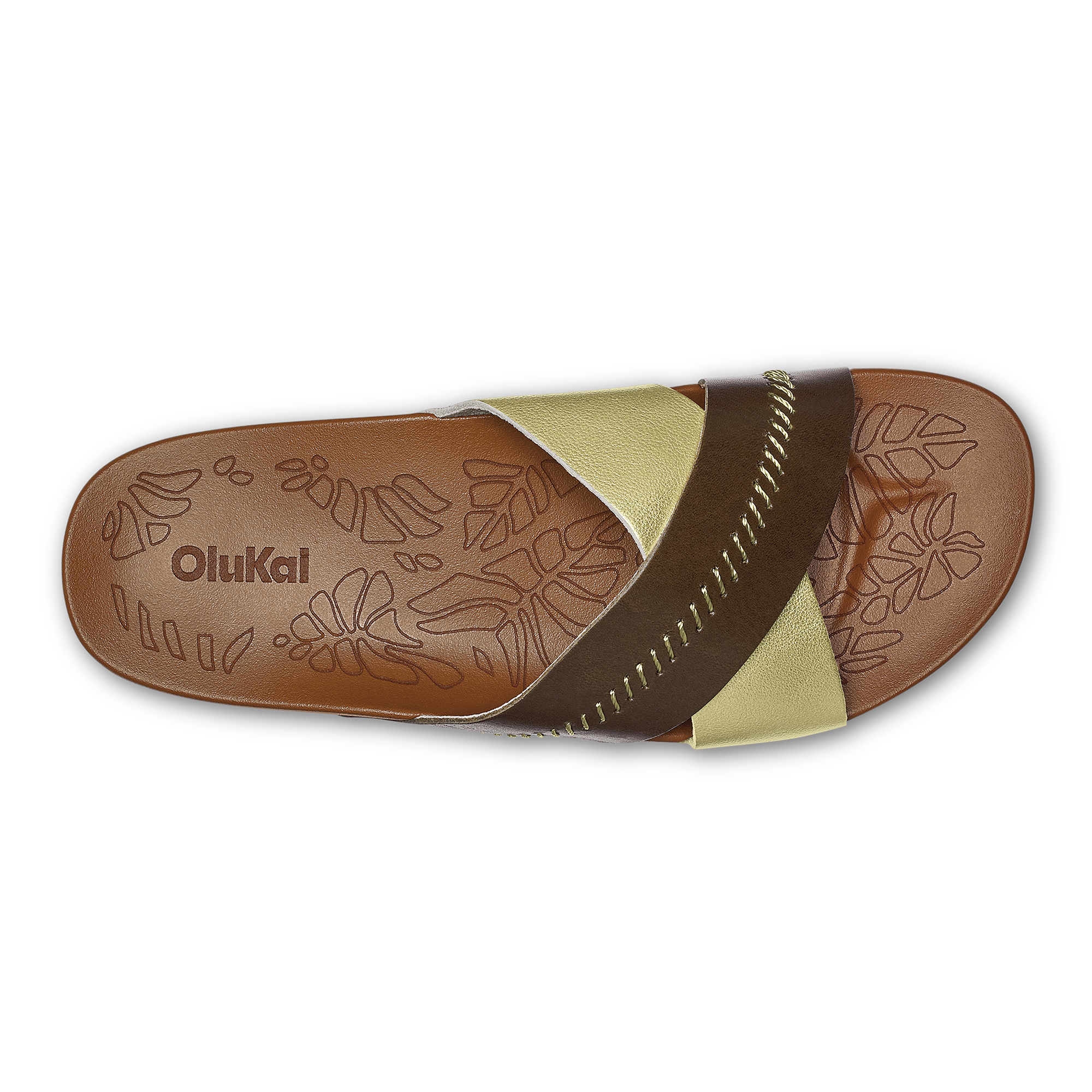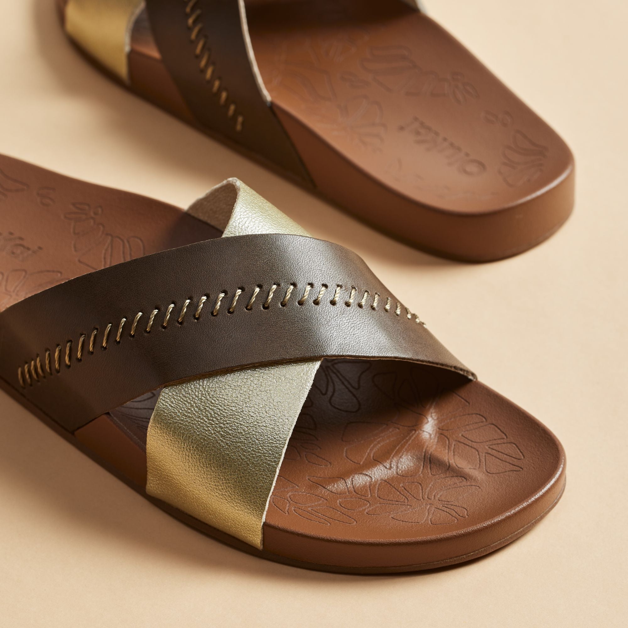 OluKai Craftsmanship: Custom stitching and delicate floral artwork on the slide reflect meticulous attention to detail. adding a distinctive handcrafted touch.