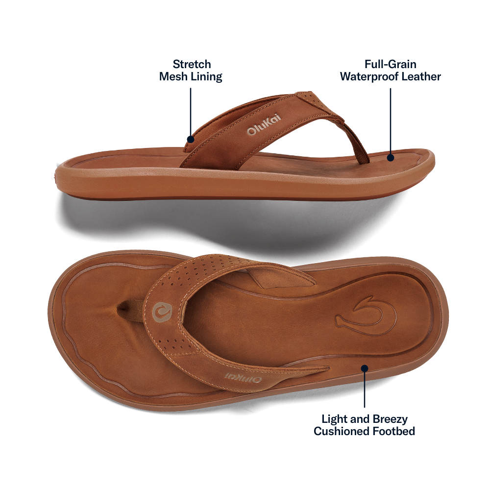 Designed with a lightweight feel and a sleek. low-profile shape. the Pili moves throughout your day. Its waterproof full-grain leather strap and kapa outsole are signatures of OluKai’s superior craftsmanship. while the cushioned footbed keeps you comfortable all day.