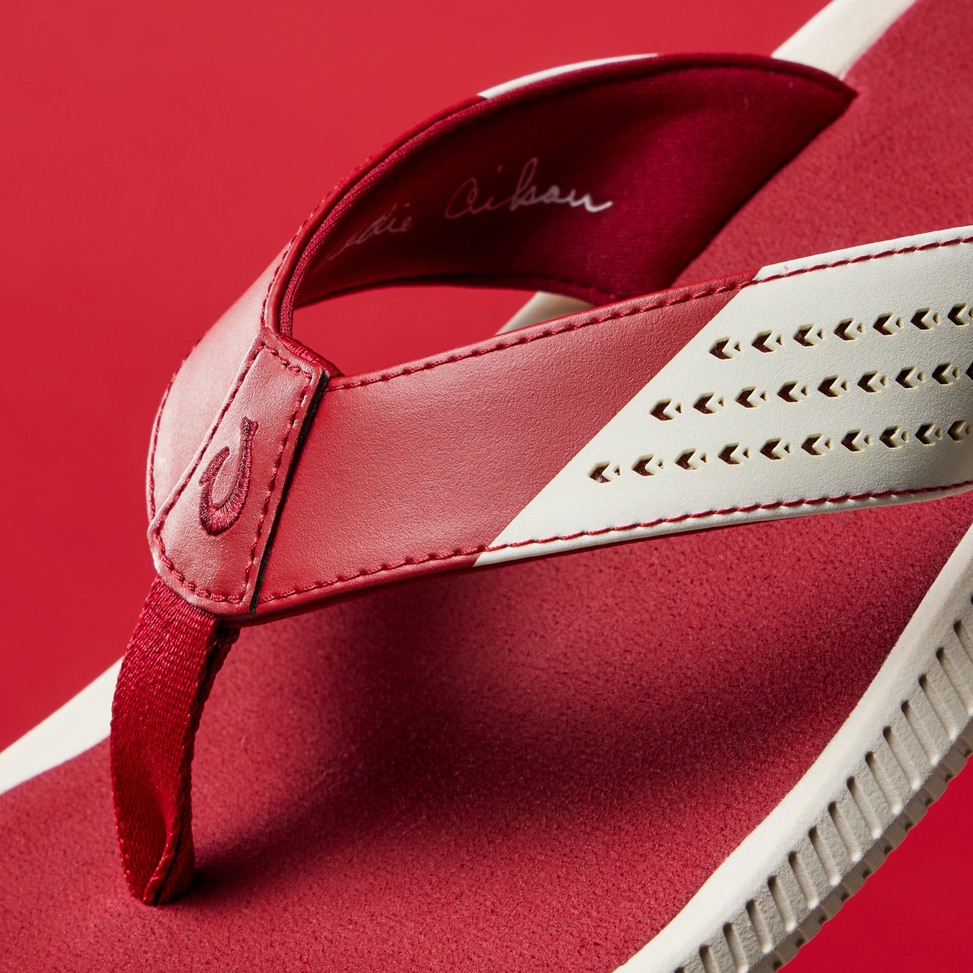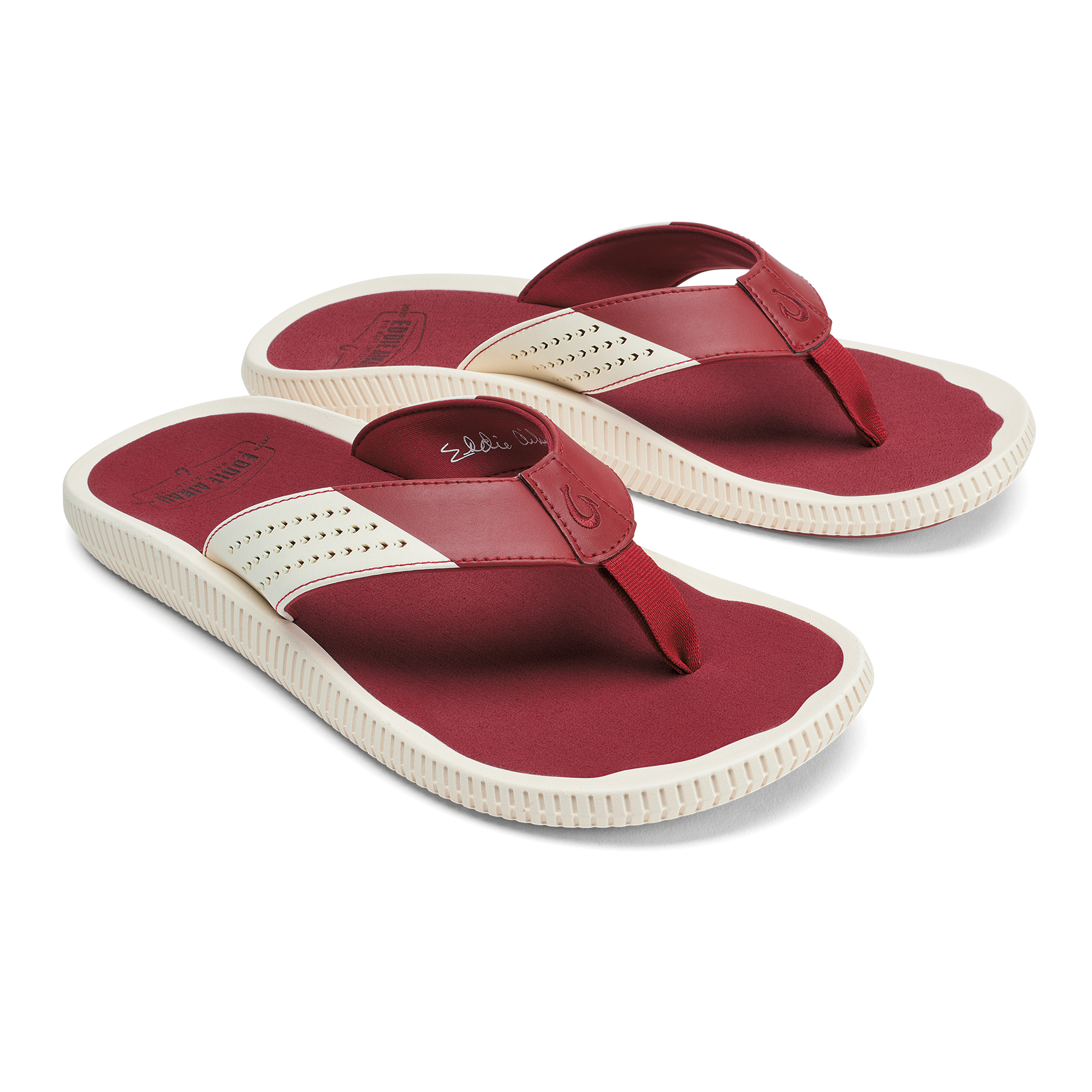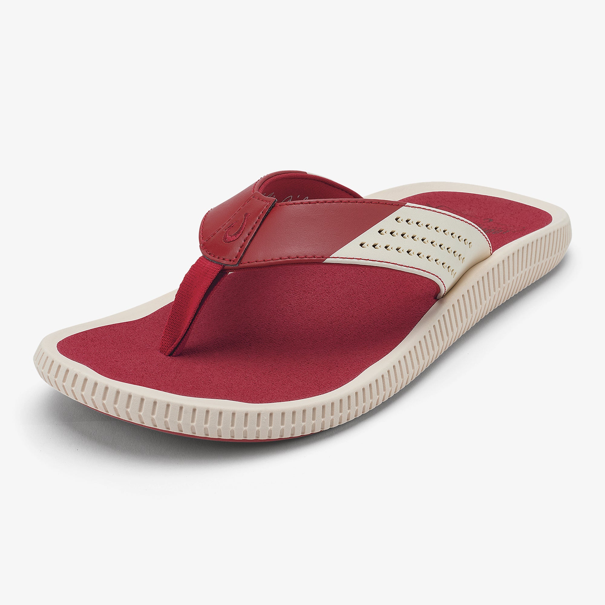 OluKai Craftsmanship: Features Kalo plant-inspired laser-cut upper straps and an embroidered hook logo.